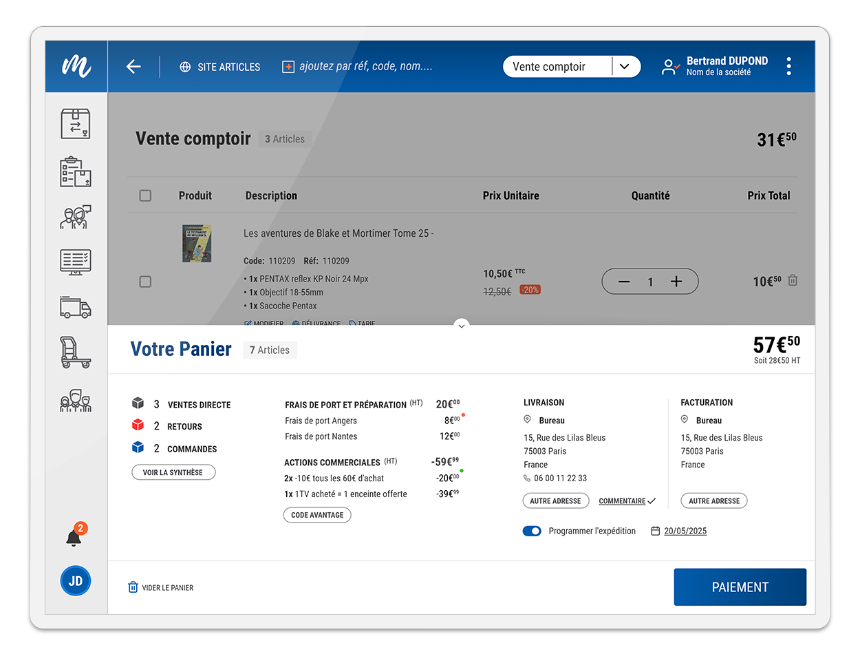 La console de vente est un outil digital moderne conçu pour optimiser et fluidifier l’expérience de vente, que ce soit en magasin ou en mobilité. Avec une interface responsive, elle s’adapte parfaitement aux écrans de PC, tablettes et smartphones, offrant une utilisation flexible et intuitive pour les vendeurs.